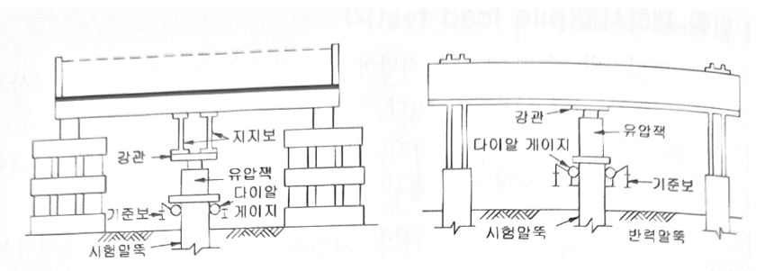 하중을 가하는 방법과 반력말뚝 또는 반력앵커의 인발 저항을 이용하는 방법으로 크게 나뉜다.