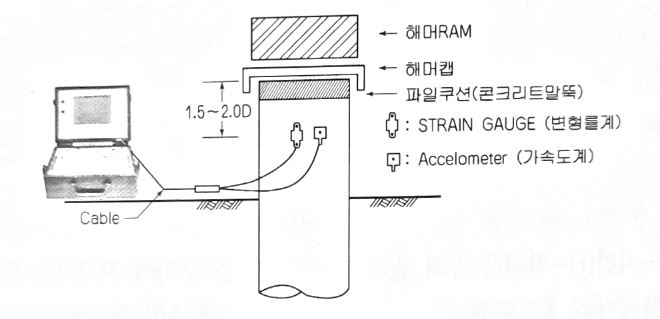 동재하시험은 파동방정식을 근거로 개발된 방법으로, 말뚝머리 부근에 변형률계와 가속계를 부착하고 말뚝항타분석기를 이용하여 항타 중에 말뚝 머리에 발생하는 응력과 변형 및 가속도를 측정하여 지지력을 추정하는 방법이다.
