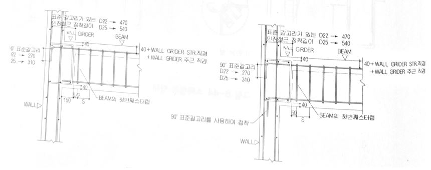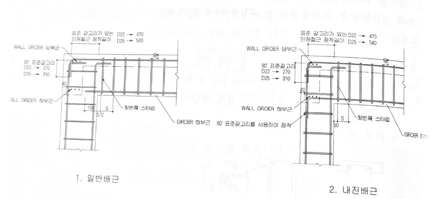 큰 보와 작은 보, 큰보와 큰보가 교차되는 부분은 보의 유효깊이를 크게하기 위하여 인장력을 받는 철근을 최외단부에 배근한다.