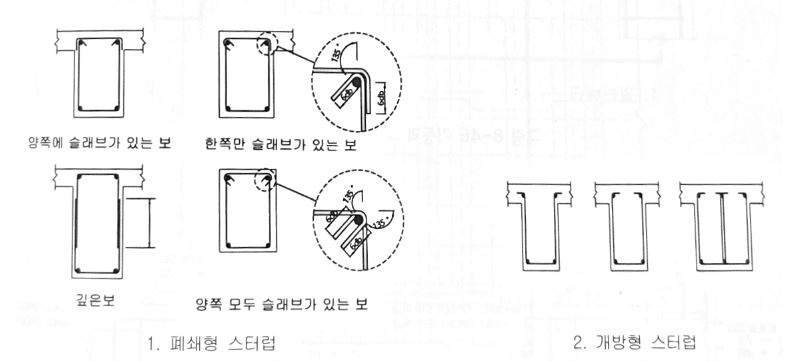 폐쇄형 스터럽은 전단과 비틀림을 동시에 받는 보나 내진설계 적용 대상인 경우에 사용한다. 개방형 스터럽은 덥개 철근이 필요 없거나 비틀림의 영향이 없고 전단에 의하여 배근이 되는 보 또는 내진설계 대상이 아닌 경우에 적용한다.\