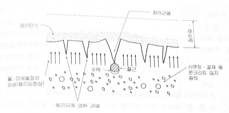 블리딩이란 콘크리트를 타설한 후 시멘트, 골재 등 콘크리트 입자의 침하에 따라 물이 분리 상승되어 표면으로 떠오르는 현상을 말한다. 블리딩에 의해 콘크리트 표면에 배합수와 함께 떠오른 부유물질 또는 녹아있던 알칼리성 물질 등이 침전한 미세한 물질 즉 콘크리트 표면에 랿은 층으로 형성된 것을 레이턴스라한다.