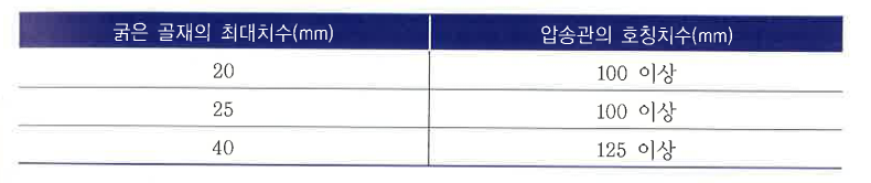 지하층 타설처럼 하향압송배관일 경우 콘크리트의 자유낙하로 인해 재료분리가 일어나 배관이 막히는 경우가 자주 발생하므로 자유낙하하는 콘크리트량보다 더 많은 양의 콘크리트를 압송할 수 있는 압송장비를 선정한다.