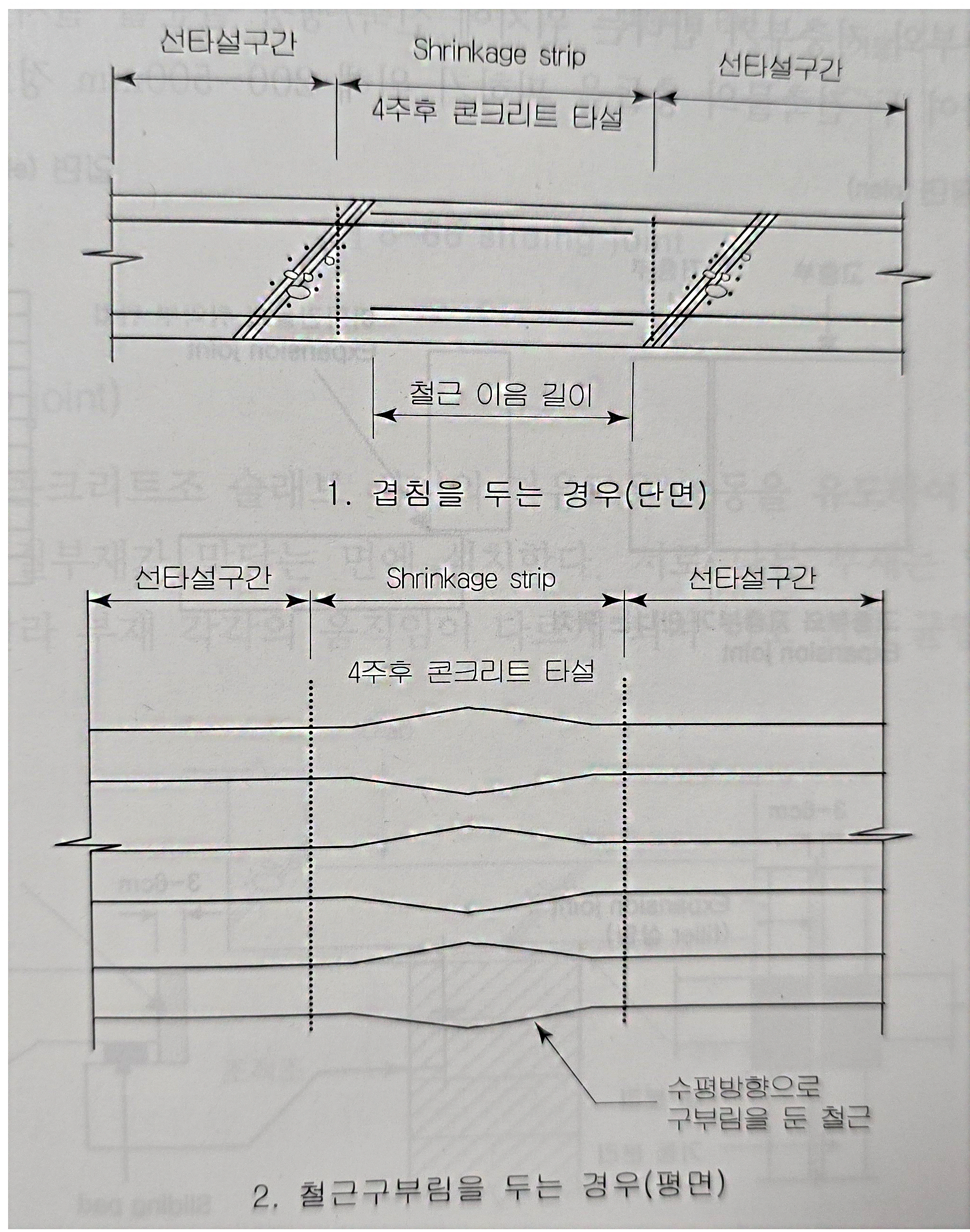 - 줄눈의 촉이 60~90cm 일 경우는 보통 콘크리트를 사용하지만, 폭이 더 넓을 경우에는 무수축 콘크리트를 사용한다.