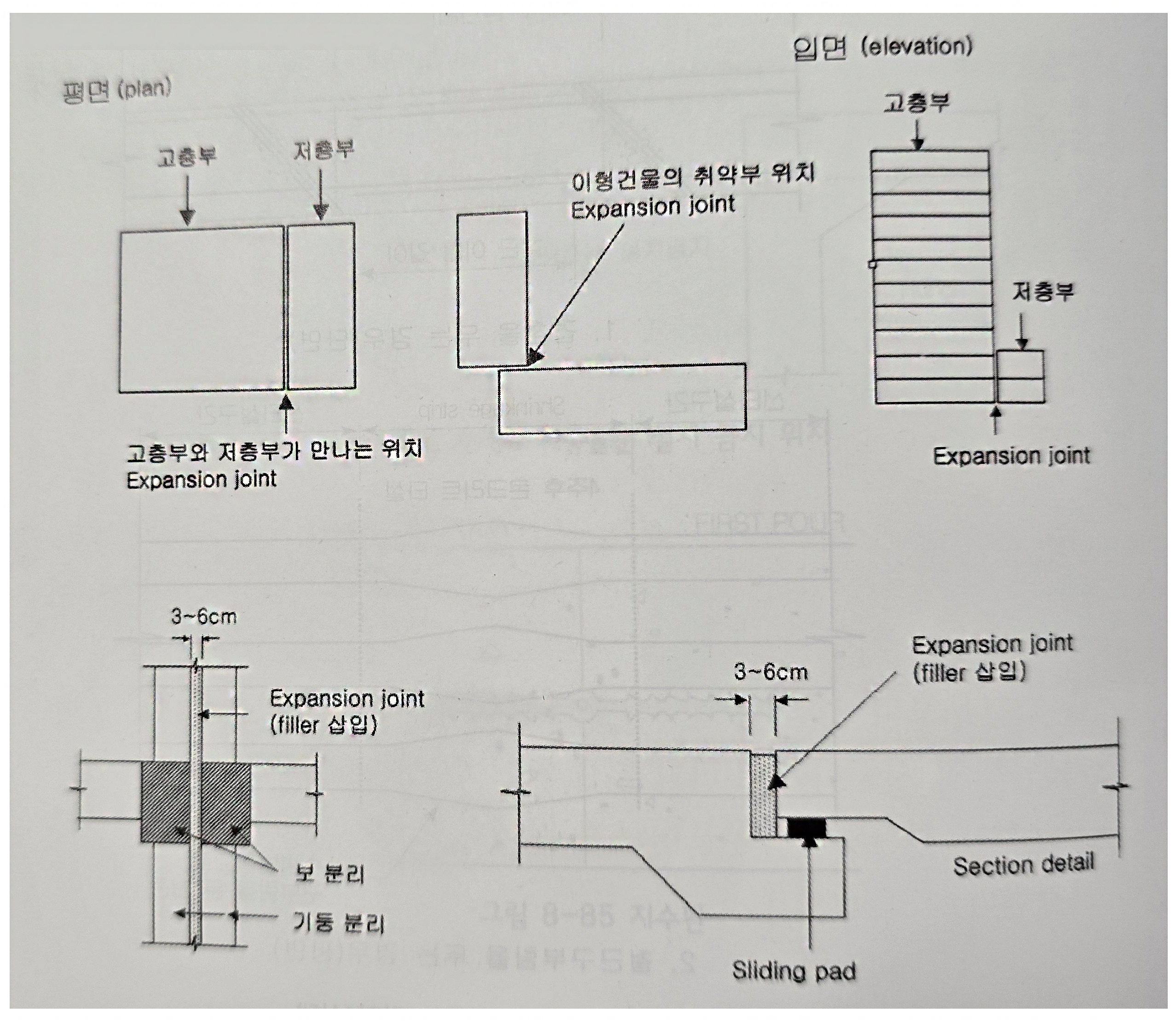 고층부와 저층부가 만나는 위치에 신축/팽창 줄눈을 설치할 경우 지진하중을 고려하여 두 건축물의 충돌을 피하기 위해 200~500mm 정도 띄어야 한다.