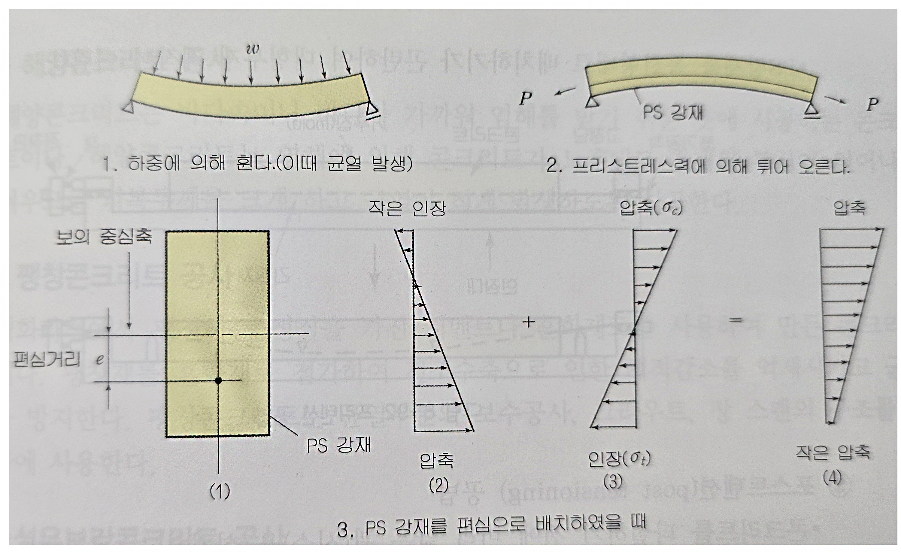 주어진 하중에 의해 부재에 일어나는 응력의 크기와 분포를 가상하여, 부재에 하중이 가해지기 전에 이를 상회할 수 있는 힘을 미리 인공적으로 준 콘크리트로 콘크리트 속에 철근 대신 강도가 높은 PS 강재를 삽입하여 프리스트레싱한다.