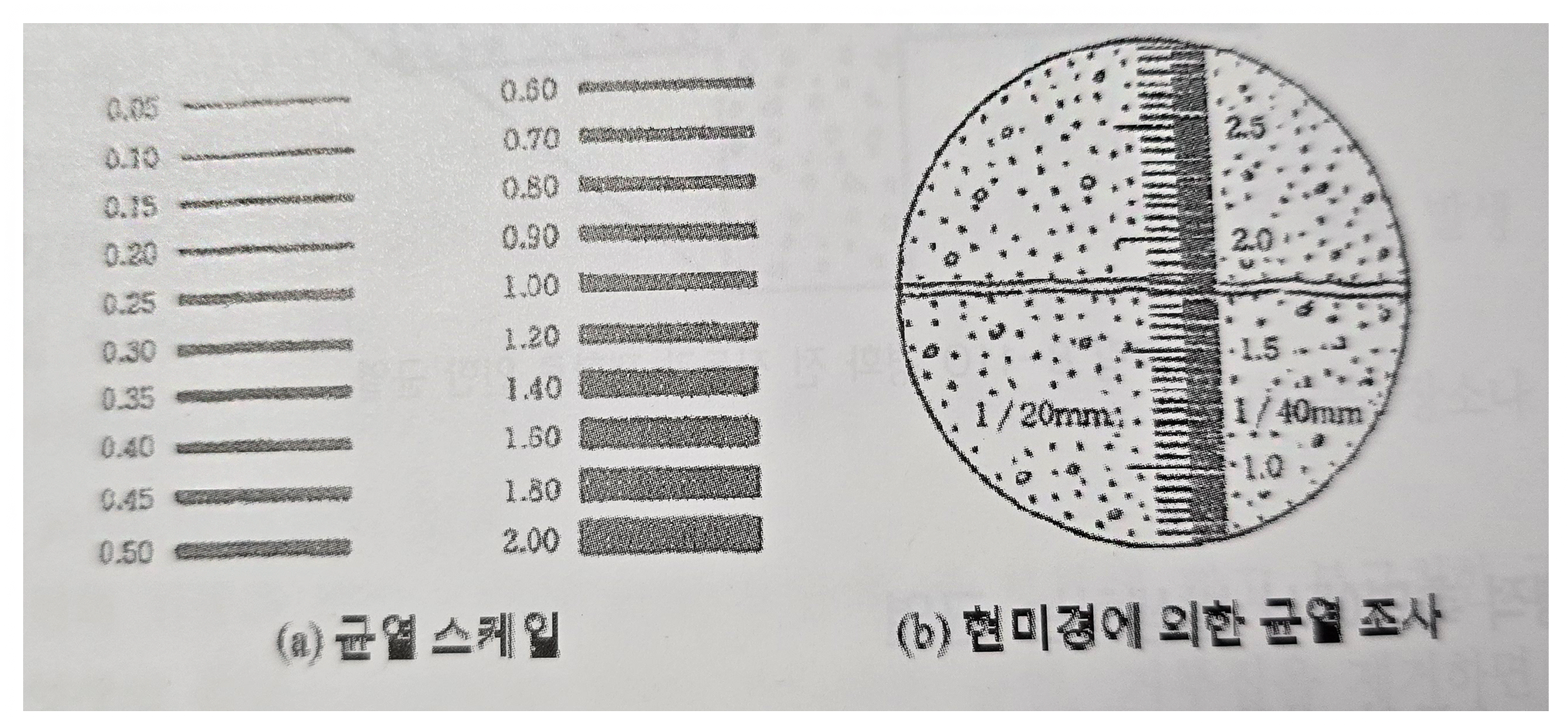 균열이 생긴 부위를 육안으로 검사하여 균열 폭과 길이, 방향, 발전 경로 등을 조사하여 구조체에 표시하고 그 부위를 스케치와 함께 사진을 찍어둔다. 균열 폭의 측정에는 다음 그림과 같은 균열 측정용 스케일이나 휴대용 균열폭 측정기를 사용하면 0.0025~0.05mm의 균열 폭까지 측정할 수 있다.