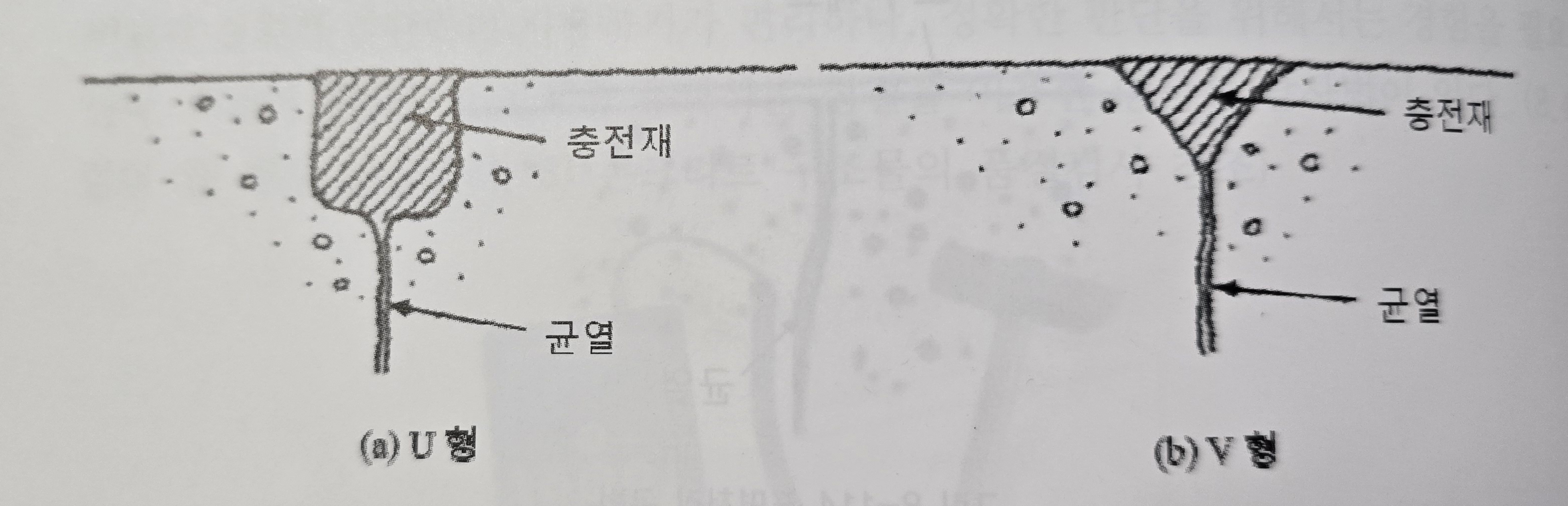 균열을 따라 약 10mm 폭으로 콘크리트를 U 또는 V형으로 절단한 부분에 다음 그림과 같이 실링재, 가소성 에폭시 수지 및 폴리머 시멘트 모르터 등을 충전해 균열을 보수한다.
