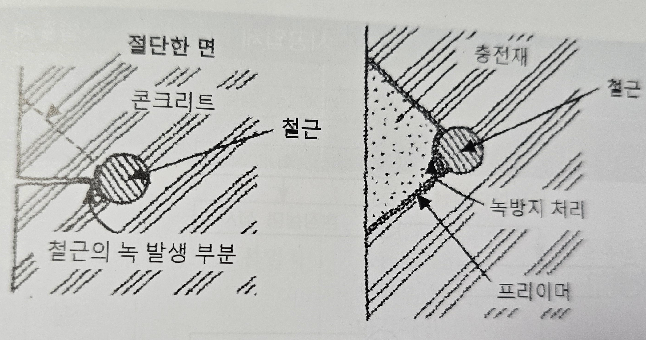 다음 그림과 같이 철근이 부식된 부분을 충분히 처리할 수 있을 정도로 콘크리트를 떼어내어 철근 녹을 제거한 다음 철근의 녹 방지처리와 콘크리트에 프라이머의 도포를 행한 후 폴리머 시멘트 모르터나 에폭시 수지 모르터 등의 재료를 충전한다.