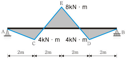 50. 다음 그림은 각 구간에서 직선적으로 변화하는 단순 보의 휨모멘트이다. C점과 D점에 동일한 힘 P1이 작용하고 보의 중앙점 E에 P2가 작용할 때 P1 과 P2의 절대값은?