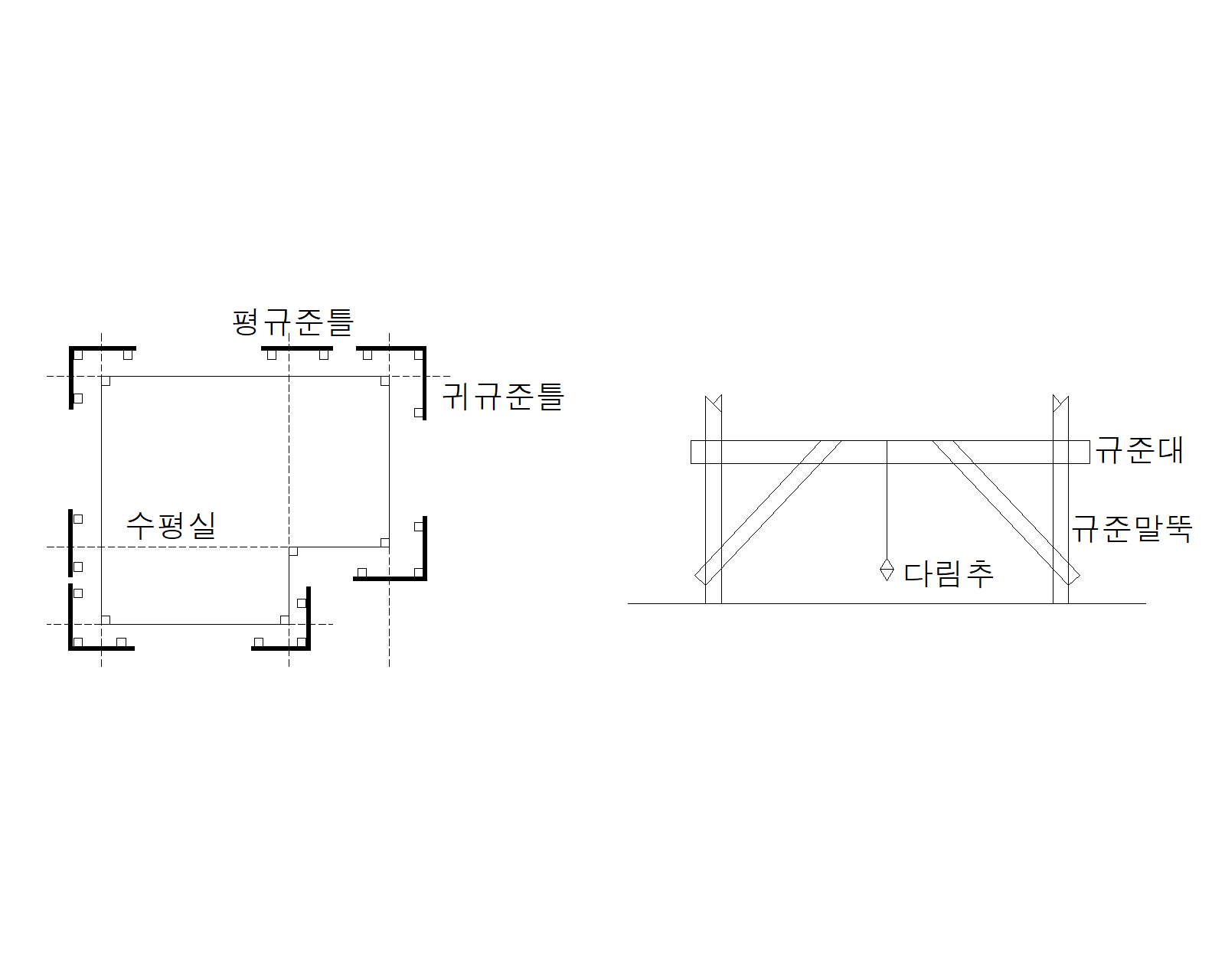수평규준틀은 건물 각부의 위치 및 높이, 기초의 너비 등을 정확히 결정하기 위한 것으로 이동·변형이 없게 견고히 설치하여야 하며, 벽에서 1~2m 떨어지게 설치하여야 한다. 규준대는 상부가 수평이 되도록 규준틀 말뚝에 박고 여기에 중심선, 기둥 크기, 기초 폭 등을 표시한다.