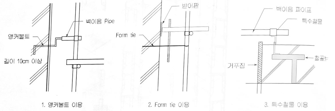 벽이음은 비계 기둥과 띠장의 교차부에서 비계 면에 대해 직각으로 한다. 폼 타이 구멍에 고정하는 브라켓 철물을 주로 이용한다.