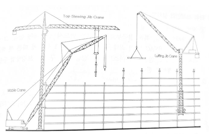 | 자재양중 | 고정식 크레인 | 타워크레인 : T형 크레인, 러핑 크레인 |