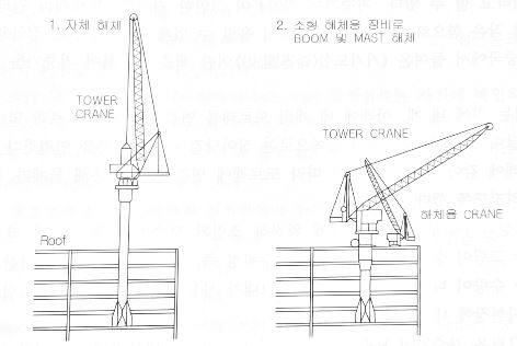마스트 상승방식은 텔레스코픽 작업을 하여 마스트를 자체 해체 후 이동식 크레인으로 지브 및 몸체를 해체 후 반출하며, 작업 공간이 필요하다. 크레인 상승방식의 경우에는 해체용 장비의 설치 및 반출 계획을 사전에 충분히 검토 후 수립하여야 한다.