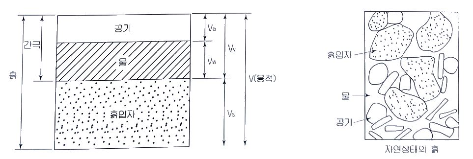 흙은 흙 입자와 그 입자 사이의 물과 공기로 구성되어 있고, 구성요소의 체적과 중량에 따라 성질이 크게 달라진다. 흙의 구성요소 상호관계는 체적과 중량으로 나타내며, 체적관계는 간극비·간극률·포화도를 사용하며, 중량 관계는 함수비·함수율을 사용하여 표시한다.