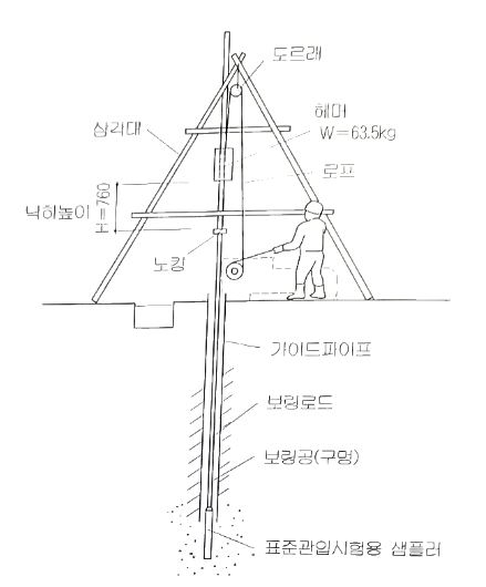 미리 뚫어 놓은 시추공에 표준 관입 시험용 샘플러를 로드의 선단에 부탁하고 63.5kg의 추를 76cm의 낙하고로 자유 낙하시켜 30cm 관입시키는데 필요한 타격 횟 수를 구하는 시험이다.