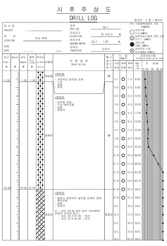 - 지층 별 N값을 확인하여 사질토의 상대밀도, 점성토의 전단강도 등을 추정하고 지반의 지지력을 추정하며, 기초설계 및 기초의 안정성 여부를 확인한다.