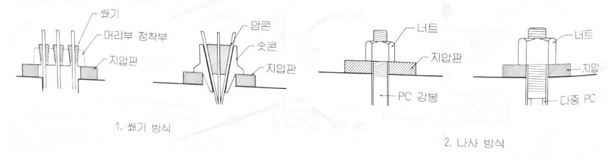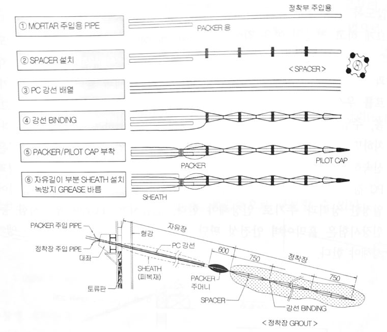 - 시공 후 인장시험, 확인시험, 인발시험, 크리프 시험, 리프트 오프 시험 등을 시행해서 앵커력 등의 상태를 확인해야 하고, 앵커 홀의 누수 가능성이 크므로 방수 조치가 필요하다.