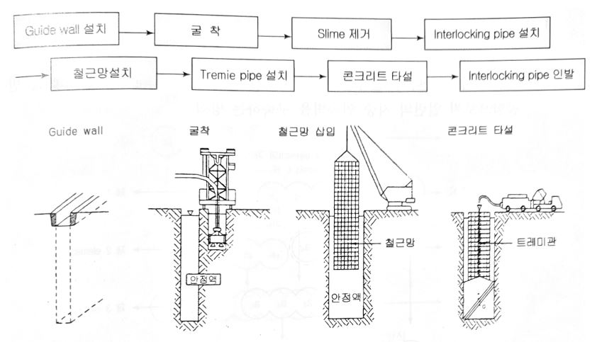 안정액을 이용하여 지하 굴착 벽면의 붕괴를 막으면서 연속 벽체를 구축하는 공법이다. Hang Grab 또는 BC 커터 등 회전식 굴착기를 이용하여 굴착하며, 수직정밀도가 불량하면 구조 내력이 떨어지고 콘크리트가 추가 소요되므로 트랜싯으로 3방향에서 수직도를 확인 조정하면서 굴착한다.