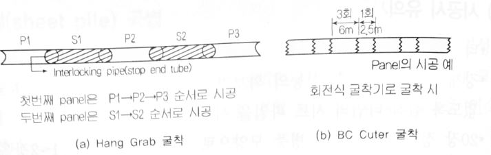 클람 셀, 하이드로 밀, BC 커터, Hang Grab, Hydro Praise 등의 굴착기계로 지반을 굴착하여 연속된 벽체를 형성하는 공법으로, 굴착 트렌치에 안정액을 채우고 굴착하여 굴착 완료 후 철근망을 삽입하고 콘크리트를 타설하여 차수 벽을 만들어나간다.