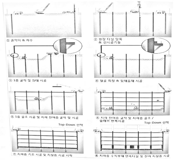 굴토 공사 진행에 따라 매립형 철골 띠장, 보 및 슬래브를 선 시공하여 토압 및 수압을 슬래브의 강막 작용으로 저항하게 하고, 굴토 공사 완료 후 지하 외벽을 연속 시공할 수 있는 공법이다.