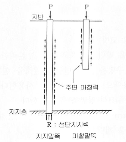 말뚝의 전체 지지력은 주면 마찰력과 선단 지지력의 합으로 구성된다. 말뚝 선단이 풍화암 이상 지층에 근입되어 지지력의 대부분을 선단 지지력에 의존하는 경우에는 지지 말뚝 또는 선단 지지 말뚝이라 부르고, 말뚝 선단이 양호한 지지층에 근입하기 어려워서 주면 마찰력에 주로 의존할 때는 마찰 말뚝이라 한다.