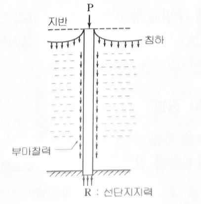 지지말뚝은 선단 지지력과 주면 마찰력으로 상부 하중을 지지하는데, 압밀침하 가능성이 있는 연약지반에서는 주면 마찰력이 하향으로 작용한다. 이때 작용하는 마찰력을 부마찰력이라고 하며, 부주면 마찰력이라고도 한다.